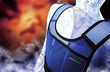 Conventional cooling products by other manufacturers require freezing at subzero temperatures (less than the water freezing point). Consequently, the material is extremely cold and the formation of condensation takes place very quickly. Furthermore, the material is usually an inorganic compound and as such it solidifies as a hard piece at low temperatures. Along with the additional weight, these products are far from comfortable to wear for racing.